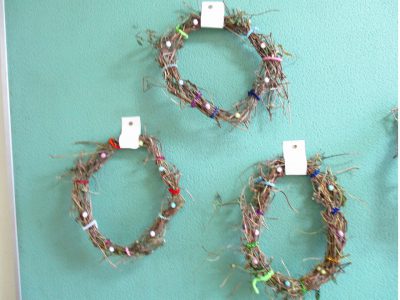 先週、輪の形にしたつるに、飾りをつけていきます。