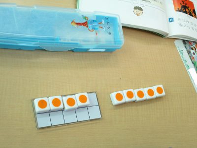 ペアになって、計算の仕方を声に出して説明する人と、その説明に合わせてブロックを動かす人に分かれています。