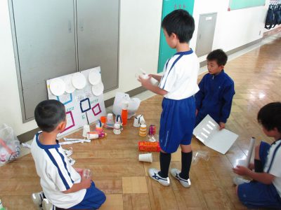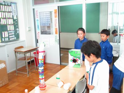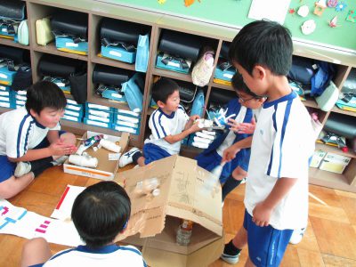 教室に戻ってから感想を聞くと、材料の使い方やルールの工夫、楽しかったこと、嬉しかったことについてたくさん発表がありました。