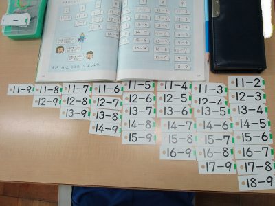 今日は、ひき算カードを使って、答えが同じになるものを順序よく並べました。