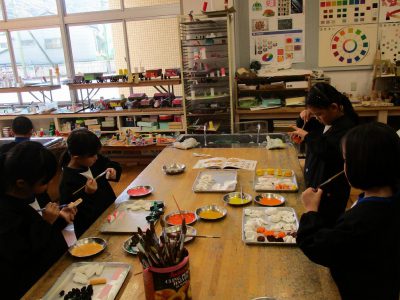 紙粘土で作ったお節料理に色を塗ったり、十二支の帽子を作ったり、お節料理の説明で使う絵を描いたり、みんなで分担して作りました。