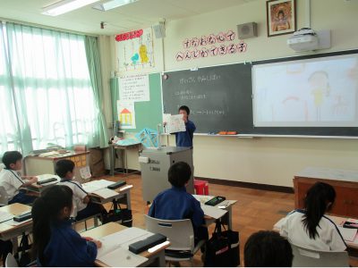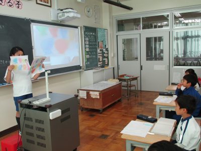 書画カメラを使って、作った紙芝居をスクリーンに映して発表します。