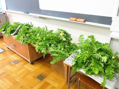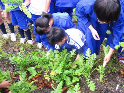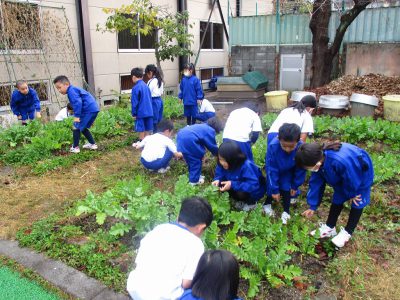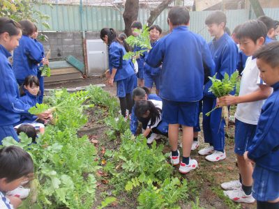 朝ねっこタイムは、9月末に6年生と一緒に種まきをした大根を収穫しました。
