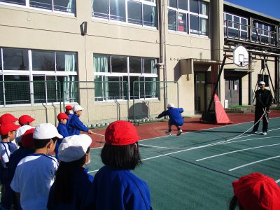 縄跳びでウォーミングアップをした後は、みんなで大縄跳びをしました。