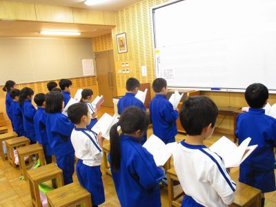 今日の音楽の時間は、2月1日の聖日参拝に向けて「四弘誓願(しぐせいがん)」と「法然上人頌」の練習をしました。