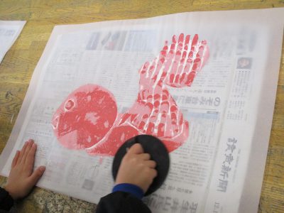 紙版画は、赤・黒・青・緑・茶色の中から好きな色を選んで刷ります。