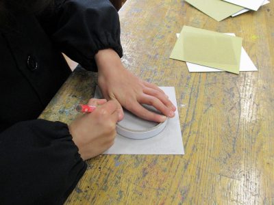 色や模様を工夫して、6年生へのメッセージを考えながら作っています。