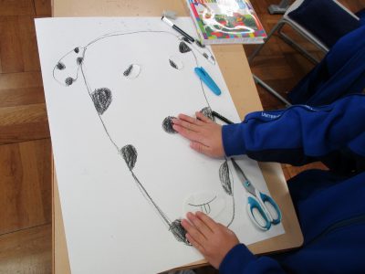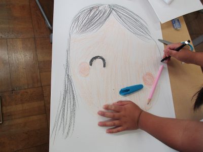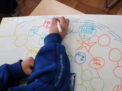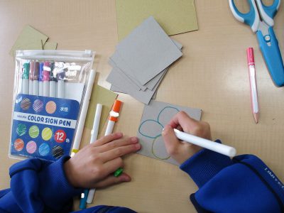 今日の生活科の時間は、「福笑い」「すごろく」「めんこ」の中から作りたいものを選んで、遊びを作る活動をしました。