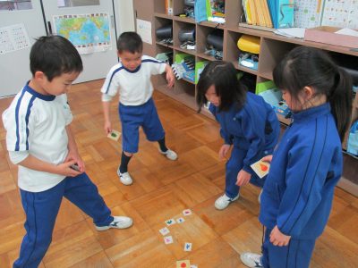 おはじきを1個、3個、5個と増やしながら遊びました。