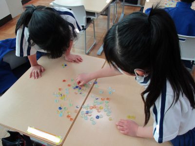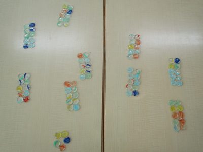 「10のまとまり」を作って、全部で何個のおはじきがあるのかをペアで数えました。