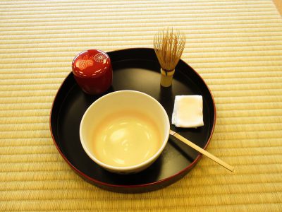 畳の縁を越える足に気をつけて、お客さんにお菓子を運びます。
