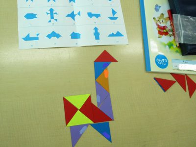 算数セットに入っているシートを見ながら、12枚の色板を使って、色々な形を作ります。