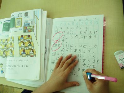 昨日から、前後、上下、左右などの言葉を用いて、ものの位置を説明する学習に取り組んでいます。