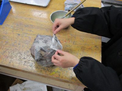 そして、形が決まった後は、くしゃくしゃにした白い紙を貼っていきます。