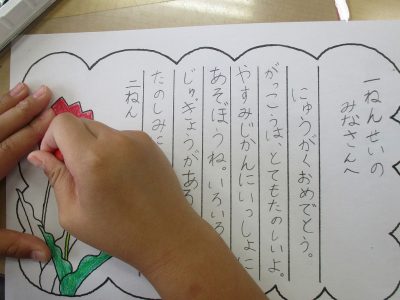「一ねんせいのみなさんへ」と書き始め、ひらがなで丁寧にメッセージを書いていきます。