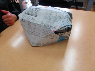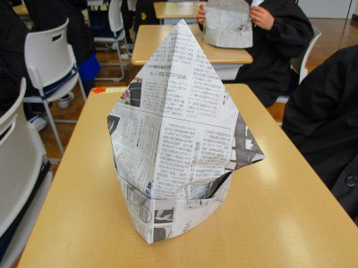 前半は、新聞紙を折って、みんなで「帽子」を作りました。