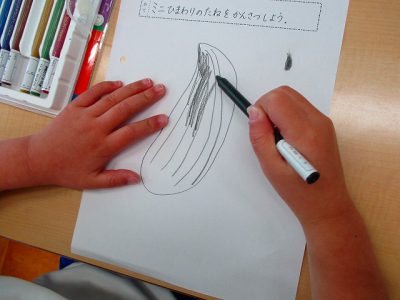 ミニひまわりの種まきをする前に、教室で種をじっくり観察しました。