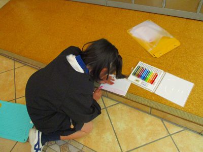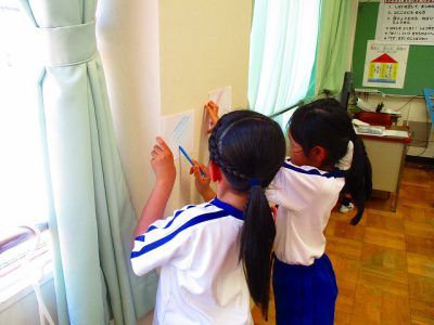 名探偵になりきり、学校中の凸凹を探しに行きました。