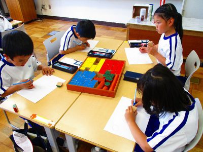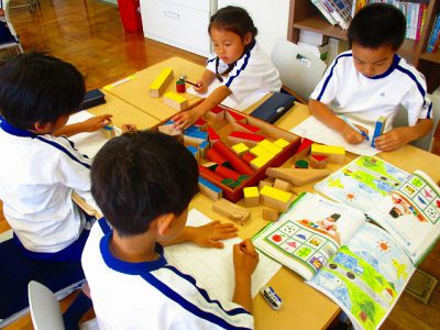 今日の算数は、積み木の形を写し取る学習をしました。