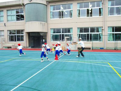 先週は半周走ることやバトンを渡すことに必死でしたが、今は「○○くん・ちゃん、がんばって!」と声をかけてバトンを渡すことができるようになりました。
