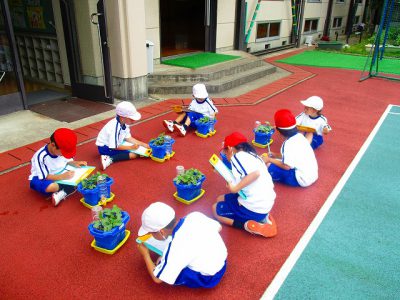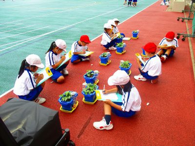 先週、双葉の観察をした時のことを思い出しながら、色や形、手触りに注目して観察しました。