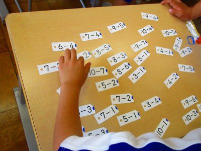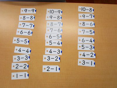 バラバラにしたひき算カードから、まず、答えが「0」になるカードを見つけます。