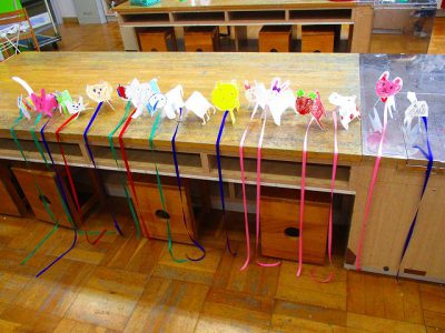 画用紙を半分に折って、動物の手足の形に切った後、顔を描きます。