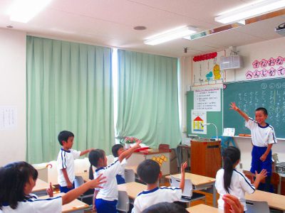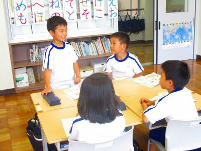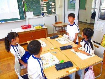 日曜日のお家での過ごし方や、習い事、図書室で借りた本のことなど、事前に話したいことを準備して、チームごとに学習を進めることができました。