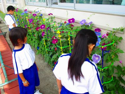 土曜日と日曜日のお休みの間に、1年生全員のあさがおがきれいに咲きました!