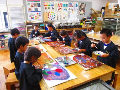 赤・青・黄色をそのまま使ったり、色を混ぜたりしながら、きれいな色を作っていました。