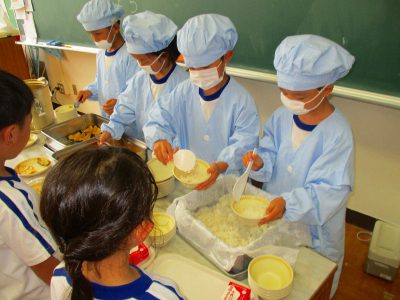 毎日、給食当番は手洗いをした後、さっとエプロンに着替えます。