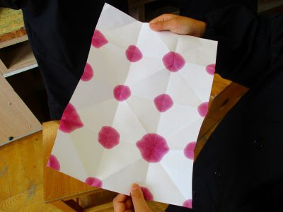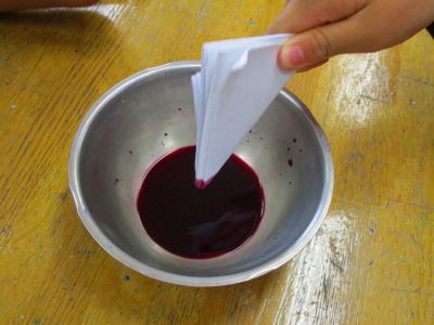 折った和紙の角にそっと色水をつけて、和紙を広げると・・・