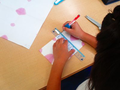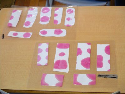 1学期末に、あさがおの色水遊びで染めた和紙を切り取って作ります。