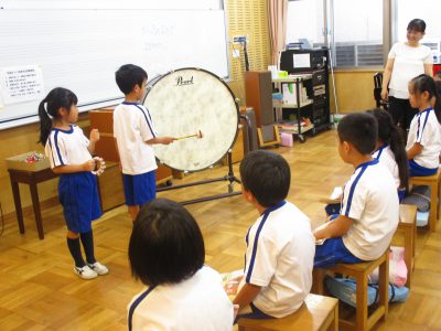 今日は、大太鼓とすずを使って、ペアで考えたリズムを発表しました。