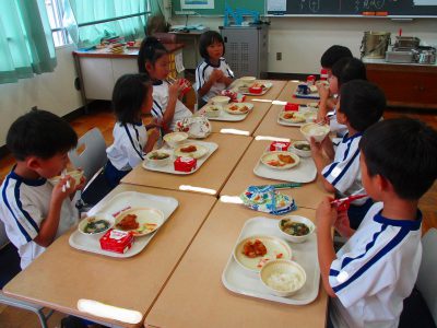 今日の給食の時間は、運動会の赤・白に分かれて座りました。