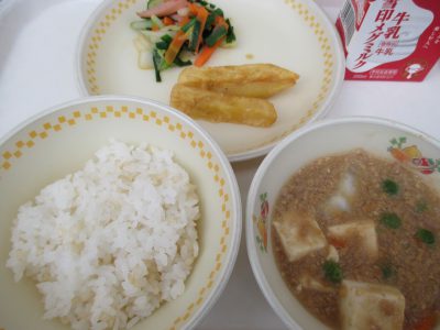 今日の献立は「マーボー豆腐・白菜のソテー・さつまいもの素揚げ」でした。