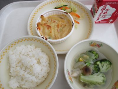 今日の献立は「マカロニグラタン・キャベツのサラダ・ブロッコリーのスープ」でした。