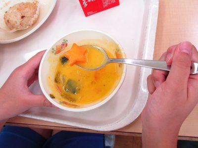具材には、かぼちゃ、人参、玉ねぎ、ベーコン、枝豆を入れ、星形の人参を各学年に5枚ずつ入れました。