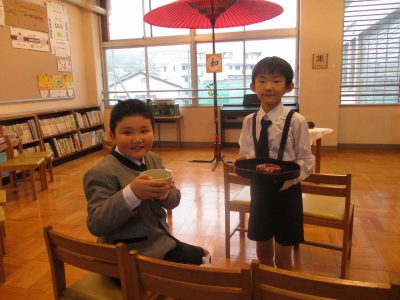 3年生4年生が、抹茶やお菓子を運ぶお手伝いをしました。