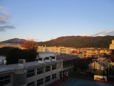 本校屋上から、永観堂の多宝塔、南禅寺三門、知恩院の三門が見えます。