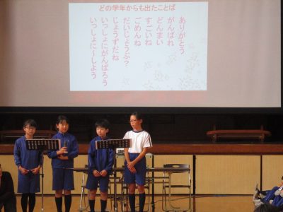 第三部では、「ふわとげ言葉を考える会」として、各学年が事前の学級活動で考えた「ふわふわ言葉」を紹介しました。