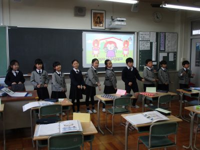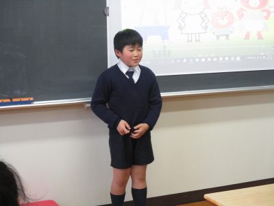 二十数回あった講座の集大成として、単語フラッシュカードを見て、意味や発音する等、これまでの学習を振り返ったり、歌を歌ったり、自己紹介の発表をしたりしました。