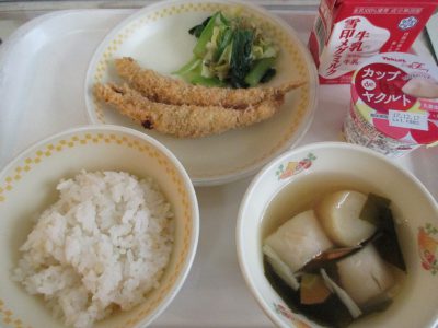 今日の献立は「子持ちししゃものフライ、キャベツのおひたし、すまし汁」でした。