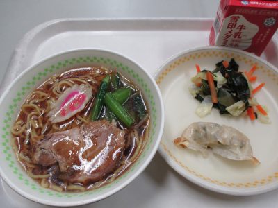 今日の献立は「しょうゆラーメン、ぎょうざ、わかめのサラダ」でした。