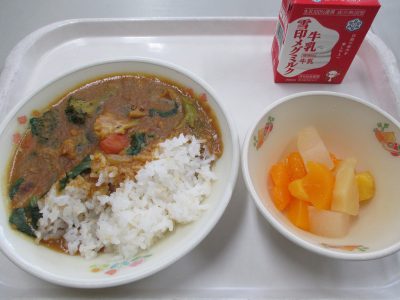給食最終日はカリフラワー、ほうれん草、大根、れんこんとたくさんの冬野菜を入れてカレーを作りました。