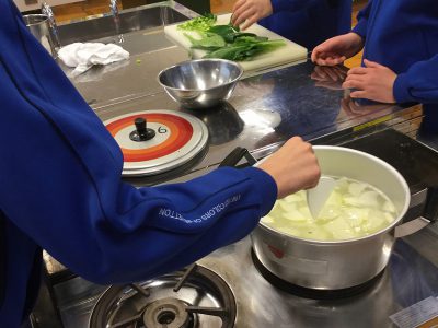 小松菜も加えたあとは、お塩で味を調節して出来上がりです。