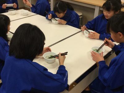 集合したときの室内は“極寒”だったのに、すっかり温かくなった部屋で“あつあつ”の“二草がゆ”をいただきました。