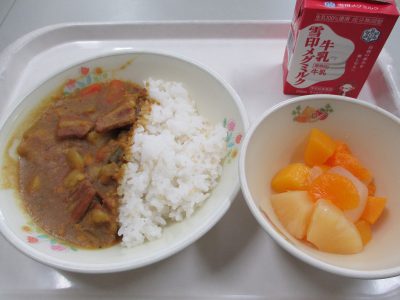 今日の献立は「ポークカレー・フルーツカクテル」でした。