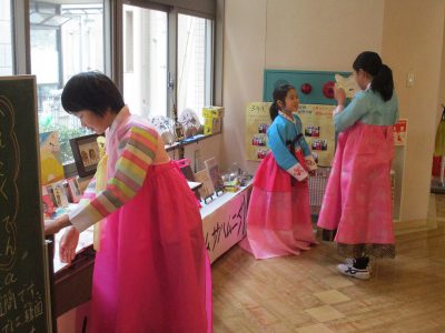 写真は、3・4・5年生が、チマチョゴリを着て、展示を見学。楽しんでくれているところ。