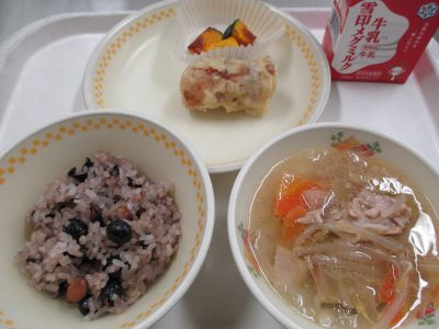 今日の献立は「黒豆ごはん、ちくわの天ぷら、かぼちゃのグリル、豚汁」でした。